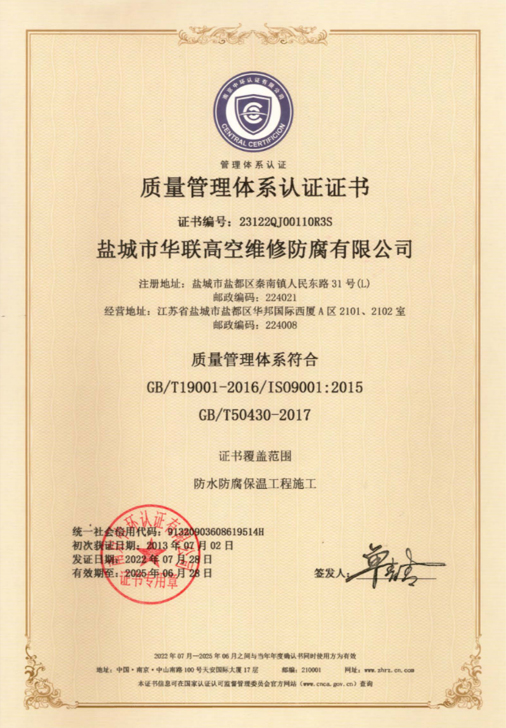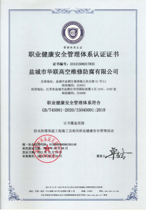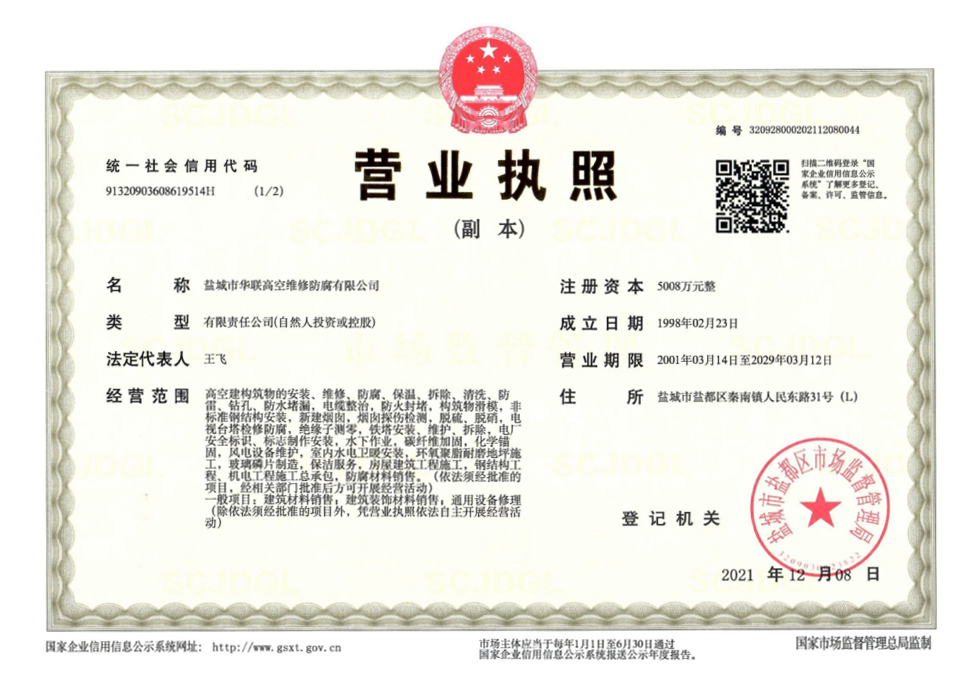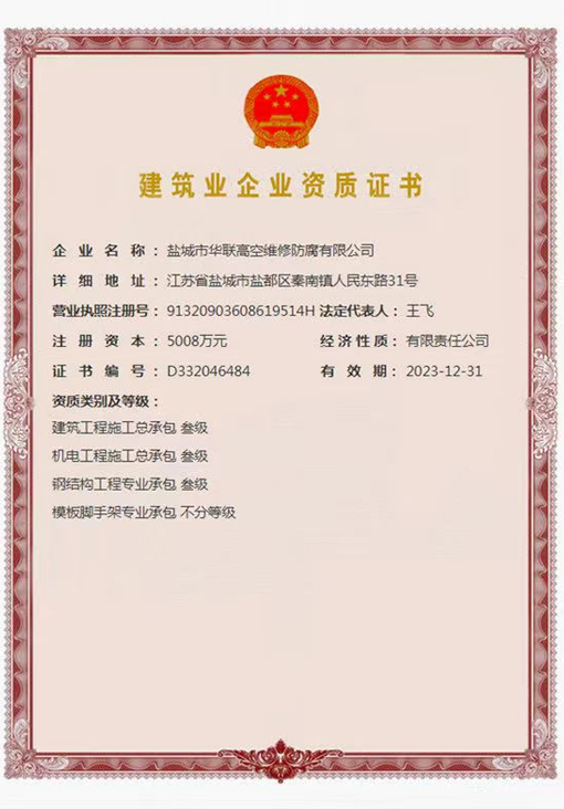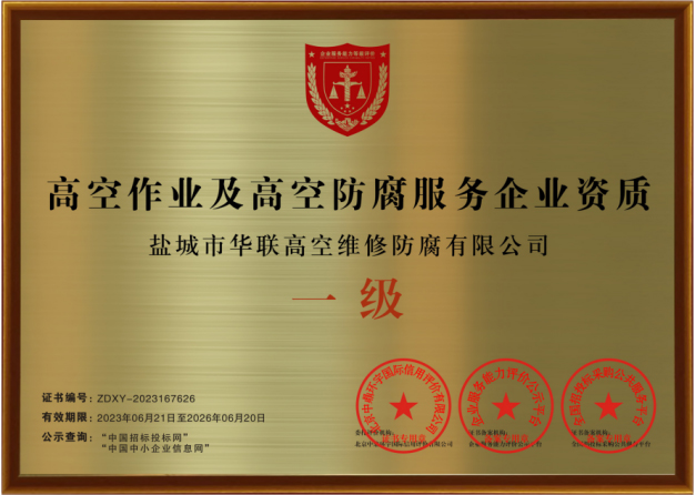 鹽城市華聯(lián)高空維修防腐有限公司始建于上世紀八十年代,系專業(yè)從事風(fēng)力發(fā)電機塔筒防腐,塔筒維護,塔筒補漆,塔筒噴字等工程。不停產(chǎn),不搭手架,高空懸吊施工的一級高空安全資質(zhì)、一級高空防腐施工資質(zhì)、二級建筑施工資質(zhì)的高空建修、防腐工程、公司?,F(xiàn)已發(fā)展集科研、設(shè)計、施工為一體的的江蘇省較大的高空建修,高空防腐施工企業(yè);公司注冊資金3008萬元,流動資金8000多萬元;擁有高修技術(shù)科研高修工程設(shè)計、高修工程施工三大技術(shù)與施工組織體系;公司擁有一流的技術(shù)施工隊伍,其中有高級職稱36 名,中級職稱126人。具備一級防腐資質(zhì)、一級安全資質(zhì)及二級建筑資質(zhì),公司下轄五個分公司和十八個辦事處,為全國數(shù)百家企業(yè)解決了若干“高、大、難”的特殊工程項目,填補了我國建筑史上的空白。
